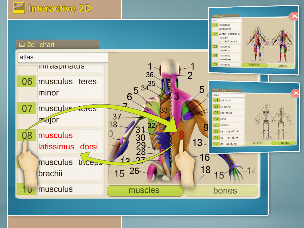 Xem tất cả các cơ và xương trong 3D tương tác đầy đủ (xoay, thu phóng, xoay và chạm) hoặc thông qua sự trợ giúp của các biểu đồ 2D tương tác. Kiểm tra và nâng cao kiến thức của bạn bằng cách làm các câu đố 3D, tìm kiếm cơ và xương theo từ khóa hoặc tìm hiểu thêm về các xương hoặc cơ cụ thể thông qua hình ảnh và thông tin chi tiết.