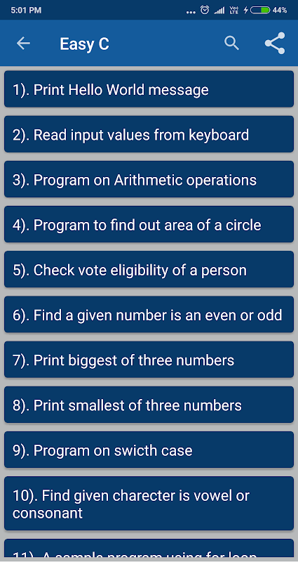 Ứng dụng lập trình Easy C chứa tổng cộng hơn 60 Chương trình C với các giải thích theo dõi kỹ thuật, được cung cấp cho người không phải là Lập trình viên cảm thấy khó khăn trong lập trình.