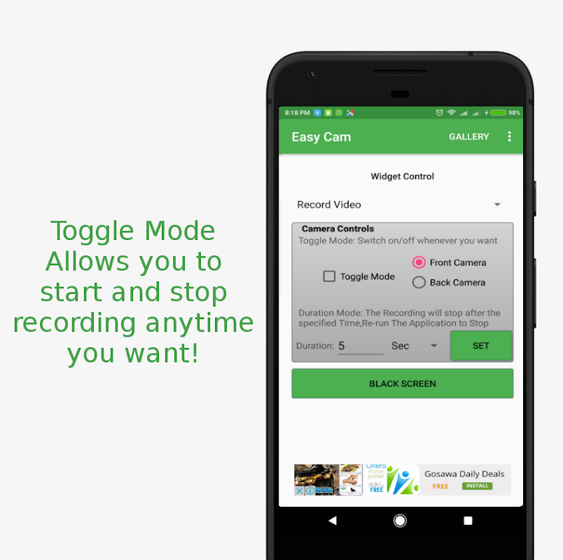 -Easy Cam grant you the ability to record video/audio and take pictures without opening any application, just via a single click on a small widget, or via the black screen mode.