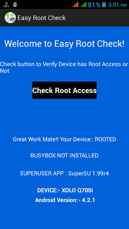 Note: THIS APPLICATION ONLY ROOT CHECK AND DOES NOT ROOT YOUR PHONE ANYTIME.
