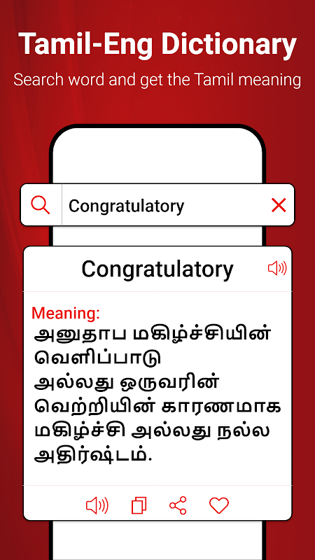Tìm kiếm nghĩa của từ trong Tiếng Tamil hoặc tiếng Anh bằng từ điển Tiếng Tamil. Một danh sách đầy đủ các từ cũng có trong mô-đun từ đồng nghĩa để bạn có thể tăng vốn từ vựng tiếng Tamil của mình. Đánh dấu cho bạn những từ và ý nghĩa của chúng là yêu thích.