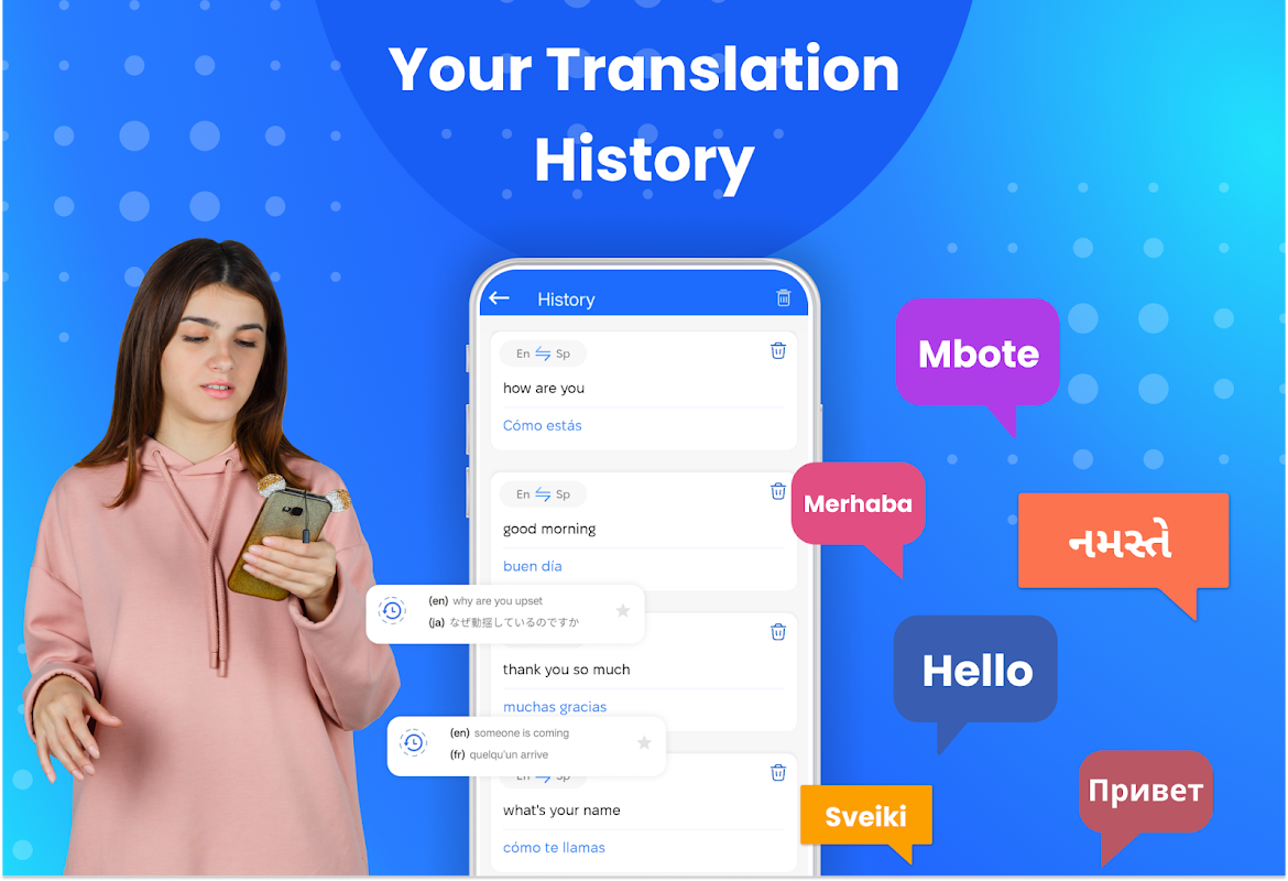 Sử dụng Easy Translate, không còn gì đáng lo ngại nữa. Easy Translate có thể giúp bạn giao tiếp dễ dàng với mọi người thuộc bất kỳ ngôn ngữ nào ở bất kỳ quốc gia nào, cho phép bạn trò chuyện thực sự trôi chảy với bạn bè quốc tế và xóa bỏ các rào cản giao tiếp!