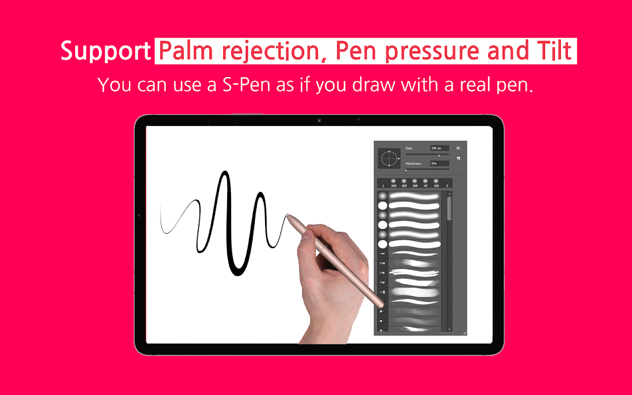 Nó hỗ trợ đầy đủ "Từ chối lòng bàn tay", cho phép bạn vẽ bằng lòng bàn tay trên màn hình cũng như "Áp lực bút" và "Độ nghiêng" của S Pen.