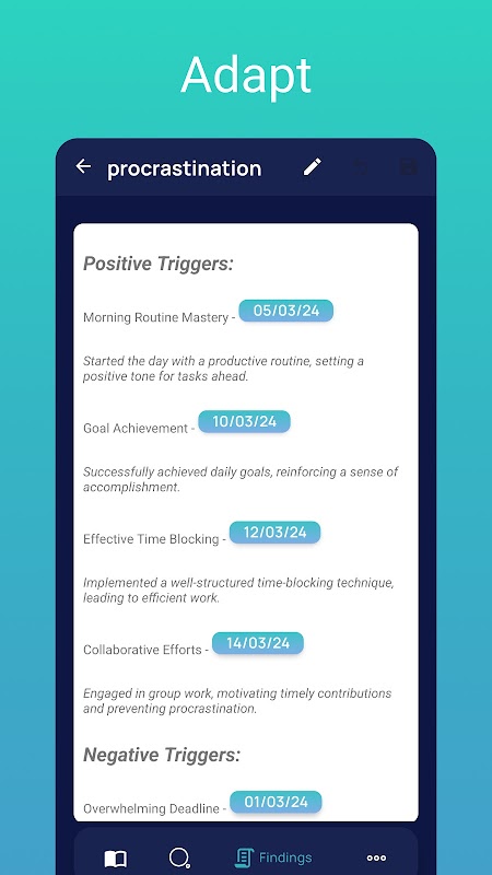 🔍 Nhận dạng mẫu: Nếu ứng dụng có đủ thông tin về bạn, chúng tôi có thể tìm kiếm mẫu. Bây giờ chúng tôi biết khi nào bạn đã đạt được mục tiêu của mình và trong tình huống và hoàn cảnh nào. Thật thú vị khi chúng ta định hướng theo khuôn mẫu! Những thói quen nhỏ nhất có thể tạo nên hoặc phá vỡ một ngày của bạn.