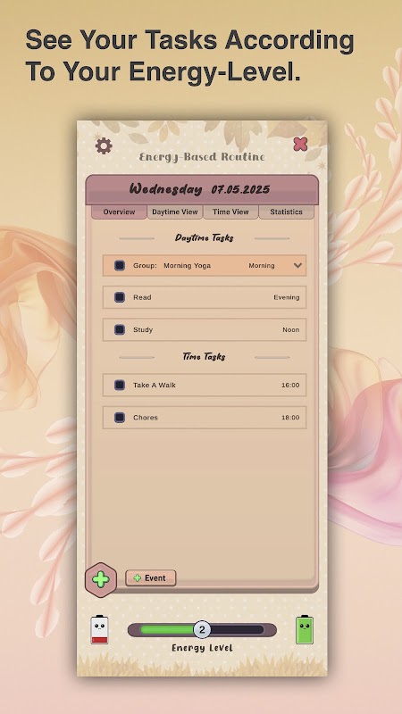Cách thức hoạt động như sau: ✅ Tạo thói quen và nhiệm vụ hàng ngày ⚡ Chỉ định mức năng lượng cho từng nhiệm vụ 🔥 Chọn mức năng lượng hiện tại của bạn bằng thanh trượt 👀 Chỉ xem những nhiệm vụ phù hợp với năng lượng của bạn – không căng thẳng, chỉ cần tập trung!