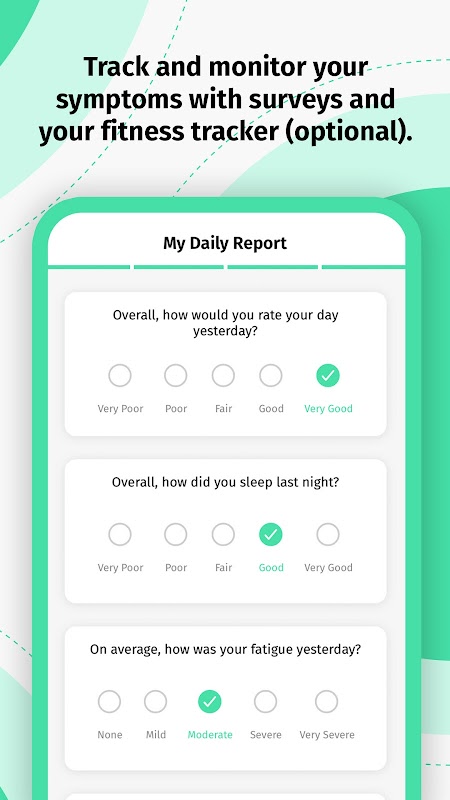 - Khảo sát nhanh hàng ngày về cảm giác của bạn và các biện pháp chuẩn hóa hàng tuần về các triệu chứng và sức khỏe toàn cầu để theo dõi tiến trình của bạn.