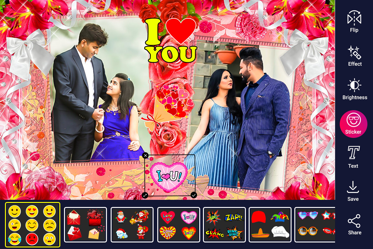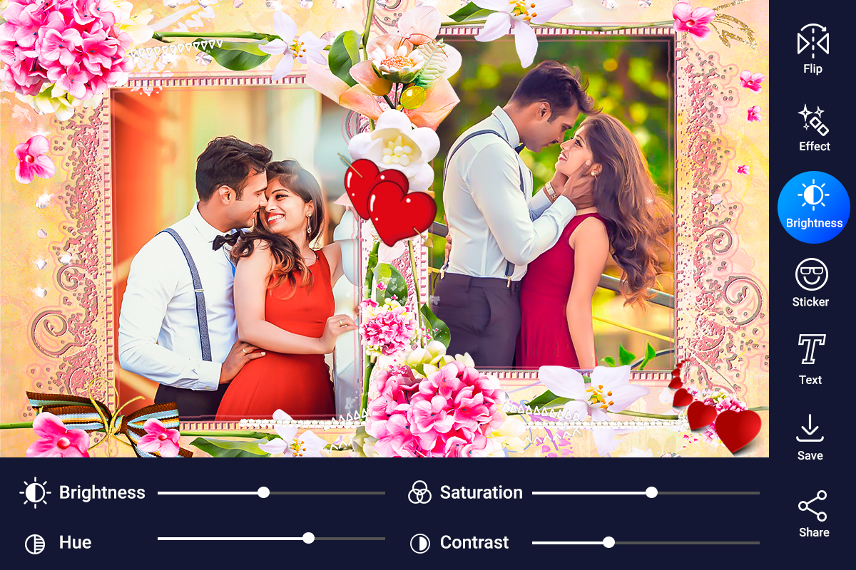 Khung kỷ niệm đính hôn sẽ trao quyền cho bạn với các hiệu ứng khung ảnh khác nhau. Chọn một bức ảnh và bắt đầu chỉnh sửa nó và là một phần của bức ảnh kỷ niệm đính hôn.