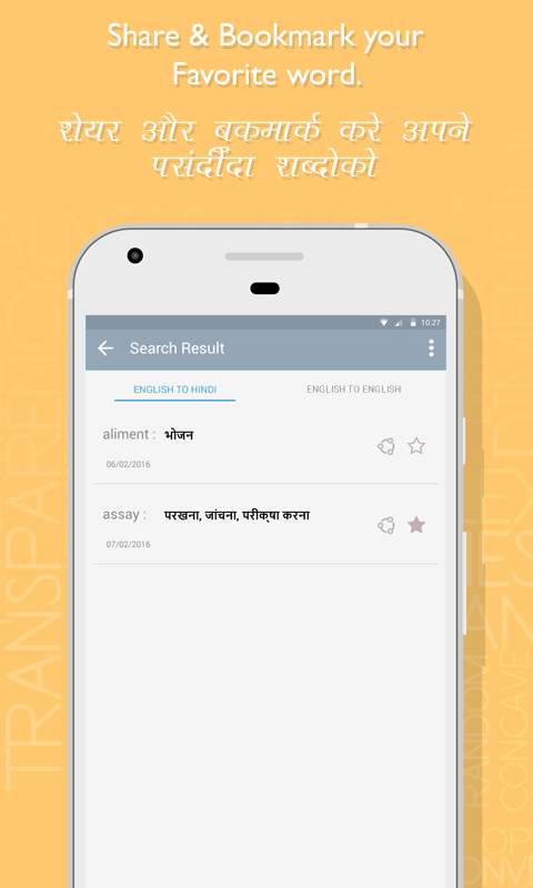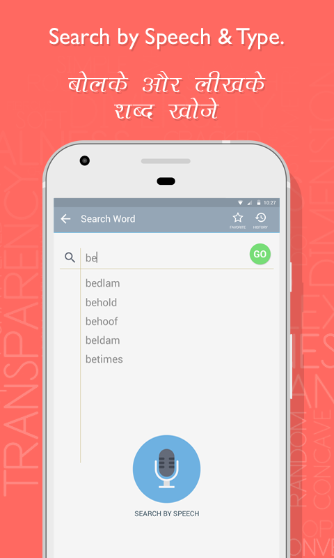 Use the dictionary option and improve your English vocabulary via this app. Search the meaning of any English word and get all the information you need regarding that particular word. English to Hindi Dictionary and Hindi to English Dictionary and Hindi English Translator app allows you to type the English word as well as search via speech.