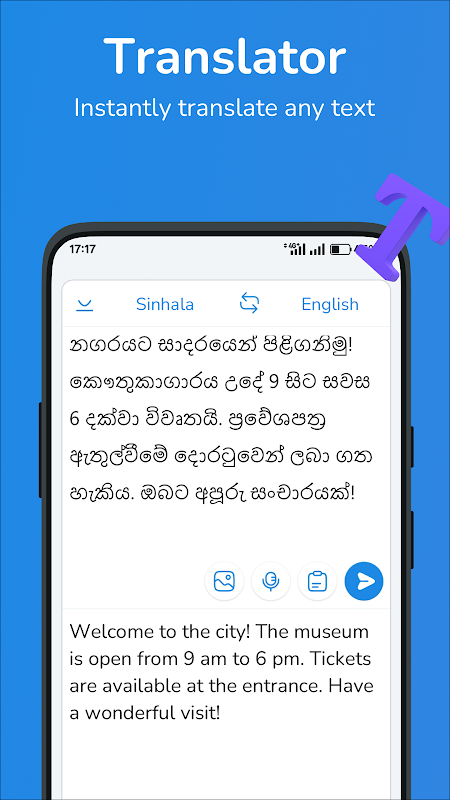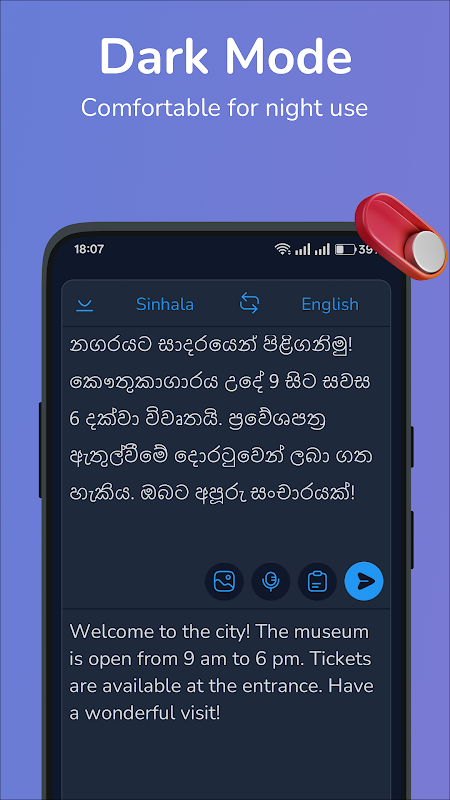 - Dịch nhanh như chớp: Nhận bản dịch tức thì ngay cả những đoạn văn phức tạp từ tiếng Anh sang tiếng Sinhala và từ tiếng Sinhala sang tiếng Anh
