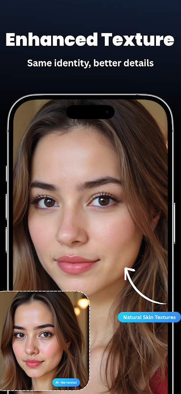 Enhance: Fix AI Skin Instantly là ứng dụng dành cho bạn để làm cho khuôn mặt do AI tạo ra trông thật đẹp. Bạn đã chán làn da hoạt hình hoặc trông như nhựa trong tác phẩm nghệ thuật AI của mình chưa? Chỉ cần một cú chạm, AI tiên tiến của chúng tôi sẽ mang đến kết cấu tự nhiên, bóng mềm mại và ánh sáng chân thực—để ảnh chân dung của bạn thực sự giống người.