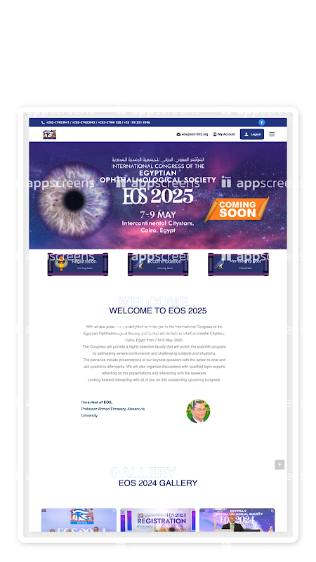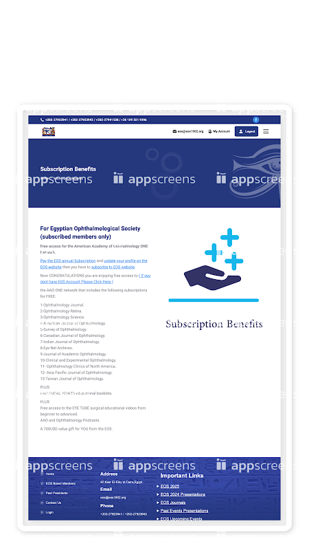 EOS application for Egyptian Ophthalmological Society all concern events information events education materials all announcements the board members users can login to the account mentioned before and find all your personal information for your society membership status make subscription and enjoy all even't and educational materials