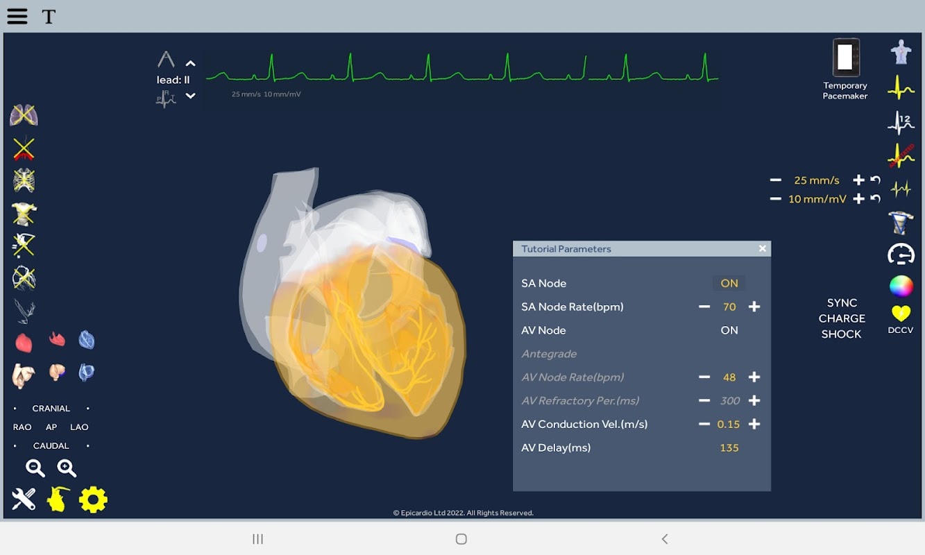 ECG là một trong những phương pháp chẩn đoán phổ biến nhất về Tim mạch mà tất cả sinh viên y khoa và điều dưỡng đều được giới thiệu ở giai đoạn đầu đào tạo. Sự tự tin và kinh nghiệm thu được từ đào tạo mô phỏng có thể giúp chẩn đoán lần đầu thành công và giảm rủi ro cho bệnh nhân. Ứng dụng này sử dụng giải phẫu 3D theo thời gian thực và kiểm soát các thông số sinh lý. Sử dụng mô phỏng điện sinh lý và tín hiệu ECG trực tiếp để mô phỏng nhịp tim bình thường.