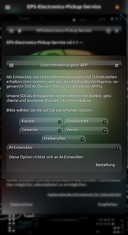 Dịch vụ nhận điện tử EPS: SDCA cá nhân (Ứng dụng hội thoại trực tiếp an toàn) cho phép bạn giao tiếp trực tiếp và đáp ứng các yêu cầu bảo vệ dữ liệu nghiêm ngặt đối với giao tiếp khách hàng ẩn danh (và không có dữ liệu cá nhân) tuân thủ GDPR của EU.