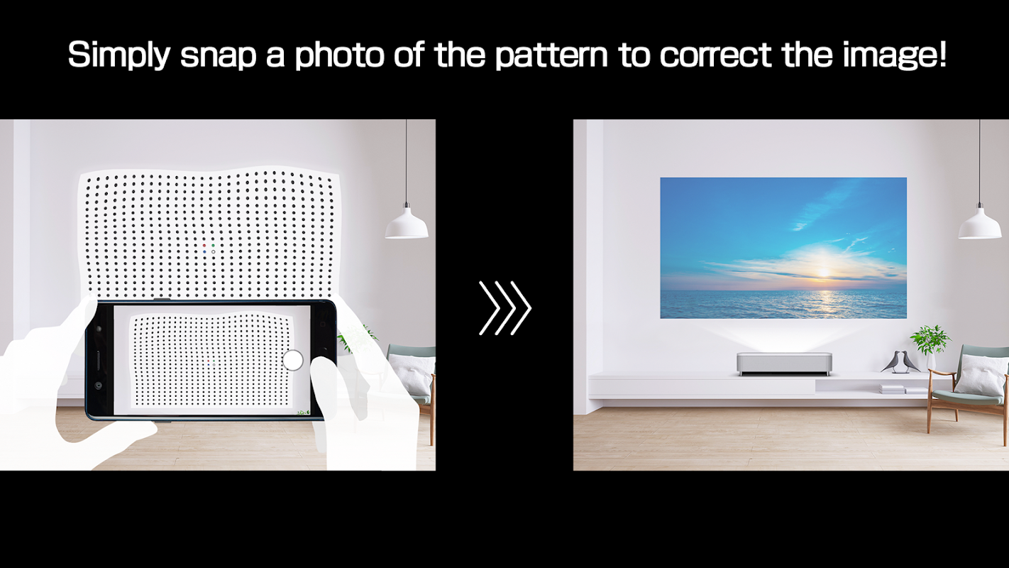 Bằng cách chụp ảnh mẫu hình chiếu, ứng dụng sẽ tự động hiệu chỉnh độ méo hình ảnh và điều chỉnh hình dạng của hình ảnh cho phù hợp với màn hình.