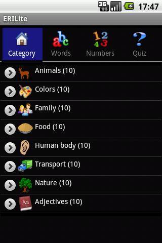 Categories: animals, colors, family, food, human body, transport, nature, adjectives, pronouns, verbs, places, seasons, months, week, day, sentences.