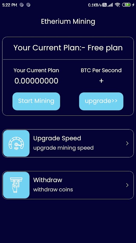 Chào mừng bạn đến với ứng dụng Khai thác Etherium cung cấp cho bạn cách mới nhất và an toàn để khai thác Etherium trên điện thoại di động của bạn mà không mất bất kỳ chi phí nào. Thiết bị của bạn sẽ tiếp tục khai thác ở chế độ nền ngay cả khi bạn thu nhỏ ứng dụng của mình và khóa điện thoại.