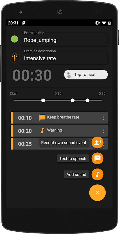Tạo thông báo âm thanh hoặc giọng nói tùy chỉnh của bạn trong khi tập thể dục hoặc nghỉ ngơi. Mỗi bài tập có thể chứa rất nhiều sự kiện thông báo âm thanh hoặc lời nói trong suốt quá trình. Bạn có thể kiểm soát kỹ thuật tập thể dục, nhắc nhở giữ nhịp điệu và truyền cảm hứng cho bản thân hoặc bạn bè của bạn.