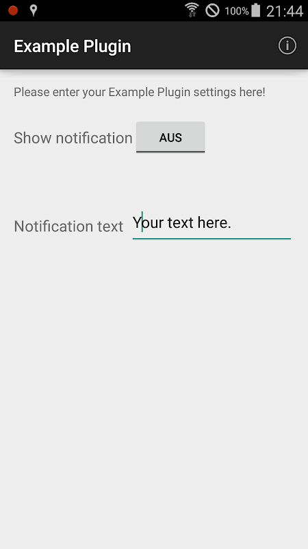 The app only displays a notification on the device, when an event occurs in EgiGeoZone and is intended as example for developers, who wants to write a plugin for EgiGeoZone.