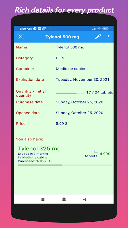 Với ứng dụng này, bạn có thể nhanh chóng và dễ dàng lưu trữ và truy xuất thông tin về sản phẩm của mình: số lượng , số lượng ban đầu , ngày hết hạn , mua và mở ngày , thùng chứa (nơi sản phẩm được lưu trữ), giá và ghi chú.