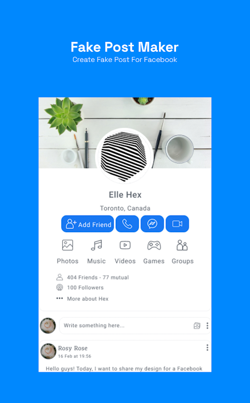 Hiển thị bài đăng cho bất kỳ ai và giả vờ là một nhân vật nổi tiếng mà bạn đã nhận được lượt thích, lượt chia sẻ lại và bình luận không giới hạn trên bài đăng của mình. Người duy nhất là bạn biết rằng đó là tweet giả mạo, nội dung giả mạo và bài đăng fasebok giả mạo của nhà sản xuất bài đăng giả mạo tốt nhất và ứng dụng bài đăng hài hước này.