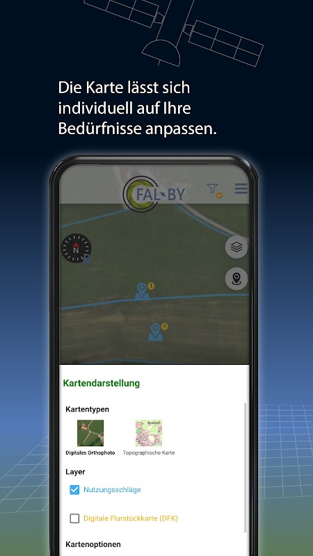 Nếu không thể đạt được kết quả rõ ràng thông qua giám sát vệ tinh, bạn sẽ nhận được một nhiệm vụ ở dạng FAL-BY với tư cách là người dùng đã đăng ký. Chế độ xem bản đồ tạo điều kiện định hướng. Sau đó, bạn có thể chụp một hoặc nhiều ảnh của khu vực cụ thể. Những bức ảnh này sẽ giúp nhân viên phụ trách của bạn tại AELF đánh giá tình hình. Trong hầu hết các trường hợp, sự khác biệt có thể nhanh chóng được làm rõ dựa trên ảnh đã gửi. Việc kiểm tra tại chỗ sau đó không còn cần thiết trong nhiều trường hợp và tiết kiệm thời gian.