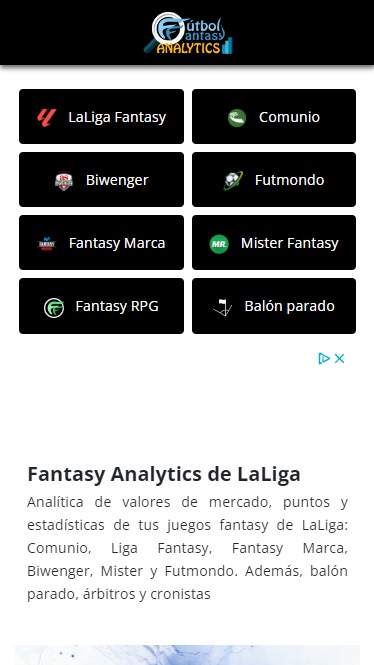 Fantasy Analytics cung cấp cho bạn tất cả dữ liệu phân tích giả tưởng từ tất cả các nền tảng và trò chơi giả tưởng ở Tây Ban Nha: Comunio, Fantasy La Liga, Biwenger, Futmondo, Mister, Fantasy Marca và Fantasy RPG.