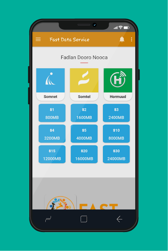 Waxaad ka iibsan kartaan xirmooyinka SomNet. Hada kadib uma baahnid in aad cid la hadashid ama qarash telefan ku bixisid si laguugu shubo xirmo SomNet hadii aad isticmaashaan Fast Data app. Sidoo kale ka waxaad ka heli doontaa Adeegyada EVC Plus, ANFAC iyo Artimet