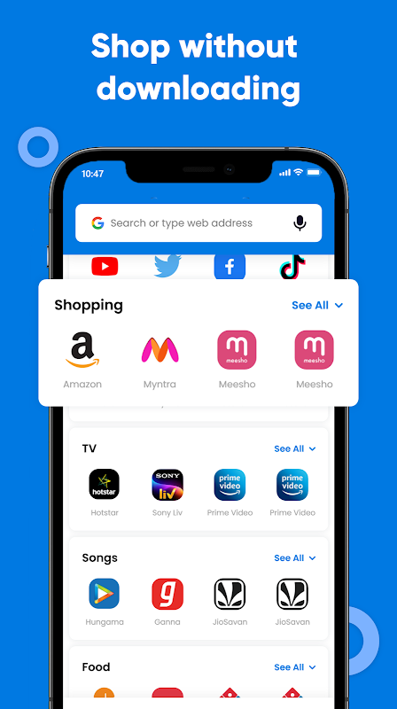 Duyệt các ứng dụng Mua sắm: Ứng dụng này cũng cho phép người dùng duyệt các ứng dụng mua sắm như Amazon, Flipkart, Myntra, Snapdeal, Ajio, Limeroad, Shopclues và TataCliq. Tính năng này có thể giúp người dùng duyệt và mua sắm một cách an toàn và riêng tư.