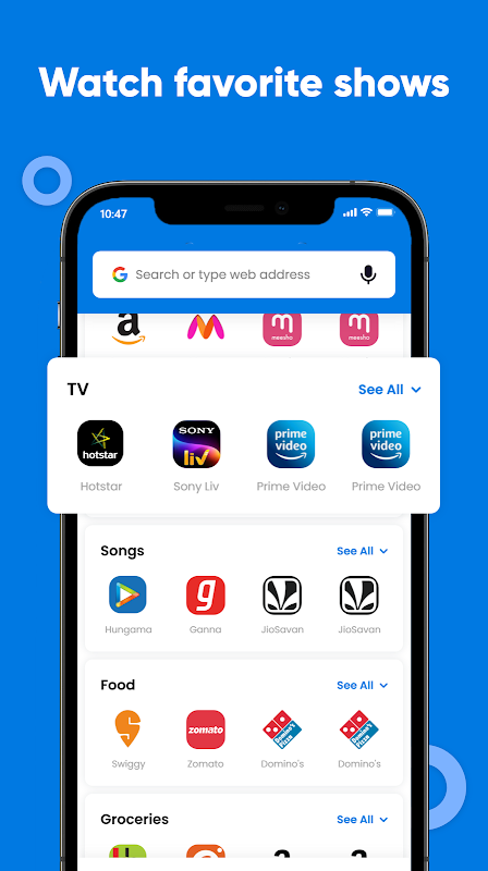 Duyệt các ứng dụng TV: Ứng dụng cho phép người dùng duyệt các ứng dụng TV như Hotstar, SonyLIV TV, Amazon Prime và Netflix. Tính năng này có thể cho phép người dùng xem các chương trình truyền hình và phim một cách ẩn danh và an toàn. Trình duyệt riêng với vpn giúp bạn truy cập nội dung bị hạn chế và tận hưởng tối đa.