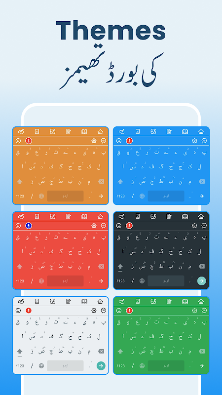 Hiện tại Easy Voice Urdu English Typing có hai chủ đề cổ điển mà từ đó người dùng có thể chọn bố cục bàn phím tiếng urdu mà mình thích. Với sự trợ giúp của các chủ đề bàn phím tiếng urdu bằng giọng nói này, bạn có thể xoay bàn phím theo ý thích của mình và tùy chỉnh bàn phím theo chủ đề và cài đặt điện thoại của bạn.