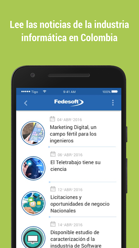 Desde nuestra aplicación podrás acceder a la información que ofrece la Federación Colombiana de la Industria del Software y Tecnologías Informáticas Relacionadas. Desde nuestra aplicación podrás: