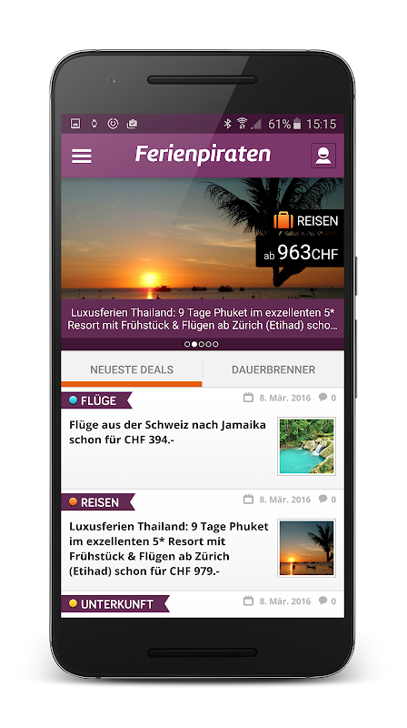 Du brauchst Ferien? Suchst du nach günstigen Flügen, Pauschalreisen, Hotels oder Gutscheinen? Dann bist du hier richtig! Du bekommst die besten Schnäppchen der Ferienpiraten direkt auf dein Smartphone und sparst jede Menge Geld bei deinem nächsten Urlaub! In der App kannst du ganz bequem unsere besten Reiseschnäppchen durchstöbern. Stell einfach deinen persönlichen Reisealarm ein und du bekommst passende Angebote als einer der ersten sobald wir sie gefunden haben.