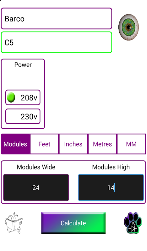 Một tính toán cho Pixels LED và kích cỡ bức tường, hoàn chỉnh với lưới điện thế hệ.