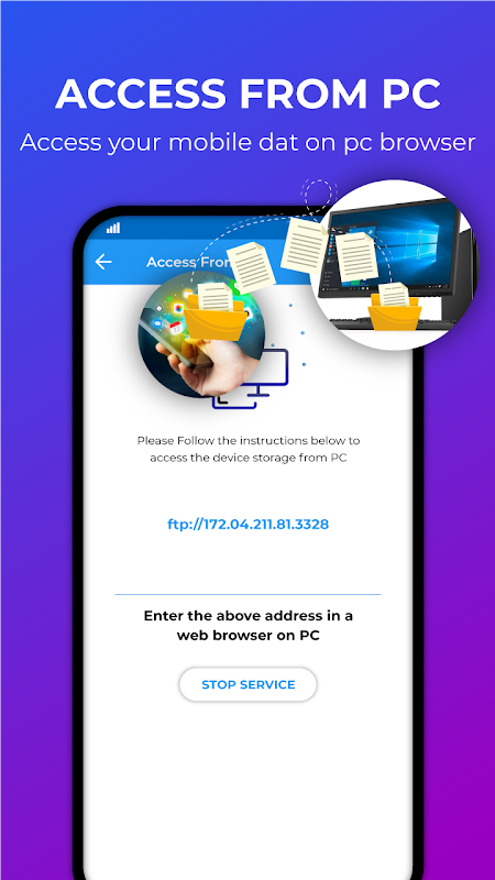 You can access your android device storage from a PC to manage files on your local android device using FTP(File Transfer Protocol). No need to connect by data cable or Bluetooth, Just type the app's given FTP address, Username & Password in your browser and manage all your Android device Folders on your PC with file manager for android.
