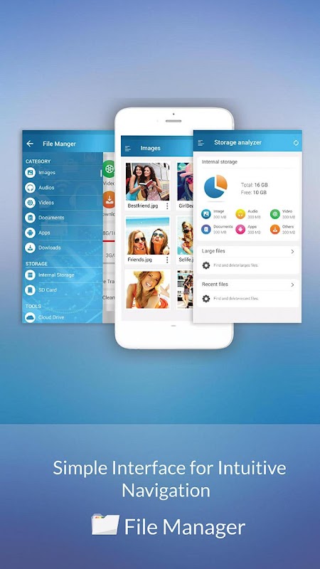 A file manager, file explorer is an app that Take control over your files. It is a small, fast, and smart Android device file manager, performance booster, memory booster, device optimizer, app manager. File Manager helps you handle all your files whether they are stored in your device's memory, microSD card, local area network, and cloud storage accounts. With File Manager’s crisp and clear UI, file management becomes easier than ever before!