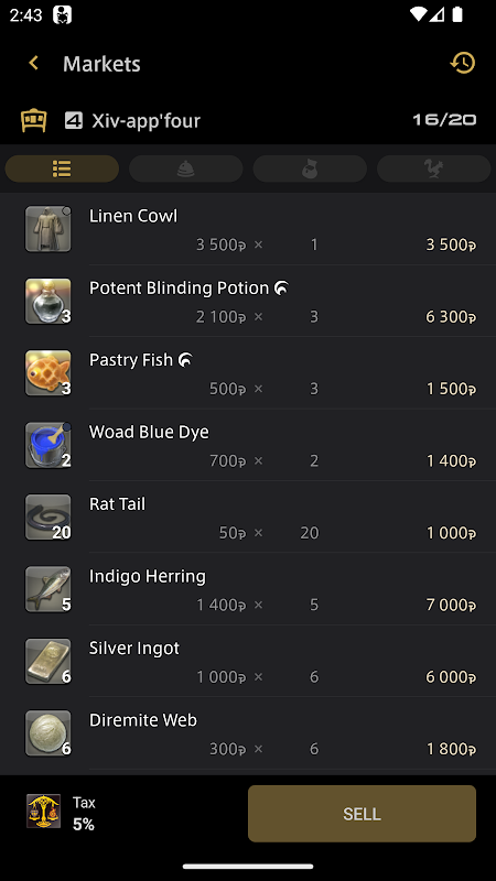Các mặt hàng có thể được mua hoặc niêm yết để bán trên bảng thị trường thông qua việc sử dụng đơn vị tiền tệ trong ứng dụng: Kupo Nuts hoặc Mog Coins. Bạn có thể nhận được Kupo Nuts dưới dạng phần thưởng đăng nhập và Xu Mog có sẵn khi mua trong ứng dụng. Xin lưu ý rằng quyền truy cập vào bảng thị trường thông qua ứng dụng Đồng hành FINAL FANTASY XIV không khả dụng khi đăng nhập vào trò chơi bằng tài khoản dịch vụ được liên kết.