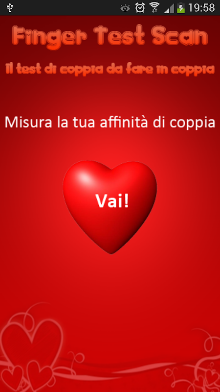 Thử nghiệm nên được thực hiện trong cặp. Và 'Chỉ cần điền tên của họ, đặt một ngón tay lại với nhau trong hộp và các ứng dụng sẽ trả về một kết quả với một tỷ lệ phần trăm của cặp mối quan hệ.