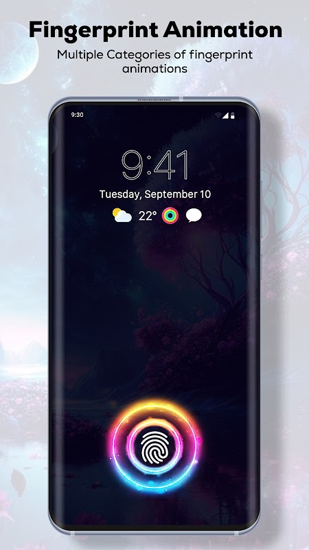 Hoạt ảnh vân tay hấp dẫn: Thay đổi cách bạn mở khóa thiết bị của mình bằng bộ sưu tập hoạt ảnh vân tay quyến rũ. Chọn từ một loạt các phong cách hoạt hình dấu vân tay đa dạng, bao gồm các vòng xoáy chất lỏng, các hạt lấp lánh, lưới tương lai, v.v. Mỗi hoạt ảnh vân tay sẽ tăng thêm nét tinh tế và sang trọng cho tính bảo mật của thiết bị của bạn.