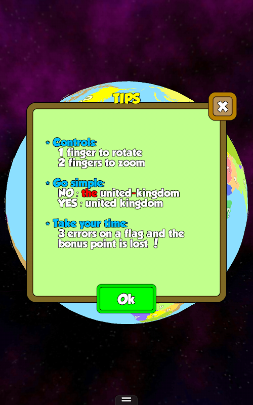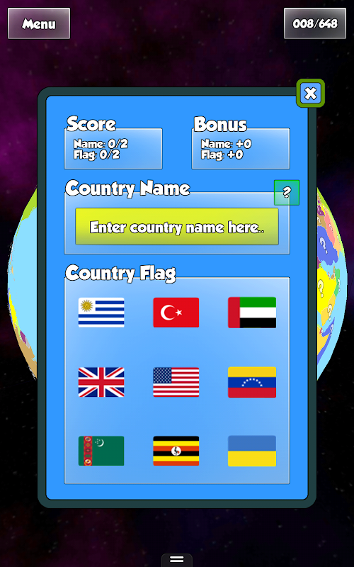 • 3 game in 1: find the country location, it's name and it's flag