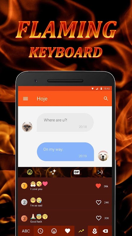 This Flaming Fire Keyboard Theme uses Facemoji Keyboard Facemoji Keyboard + GIFS. Please click the link to have it installed first.