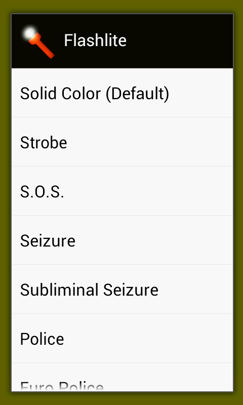 • 10 flashlight types including Strobe, S.O.S., Seizure, Police, Euro Police, Ambulance, and Fire Truck