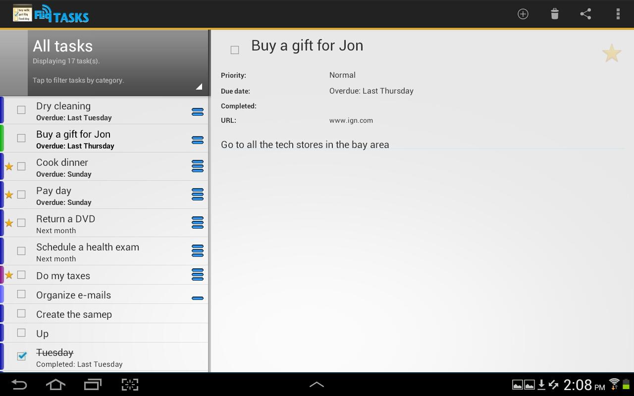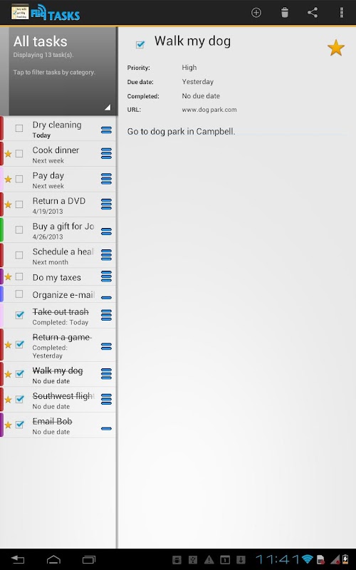 Tạo, chỉnh sửa, sắp xếp, phân hóa màu, phân loại, mật khẩu bảo vệ và sắp xếp công việc. Sắp xếp công việc bằng cách ưu tiên, thể loại, ngày hết hạn, hoặc ngày kết thúc. Hiện tất cả các nhiệm vụ, hoặc lọc để xem xét theo thể loại, những người mà bạn đã đóng vai chính, hoặc để hiển thị chỉ những nhiệm vụ đã được hoàn thành.