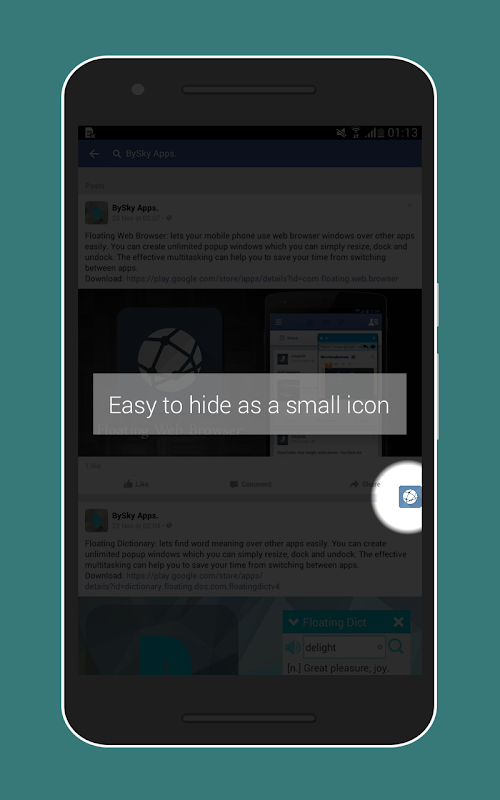 Floating Web Browser: lets your mobile phone use web browser windows over other apps easily. You can create unlimited popup windows which you can simply resize, dock and undock. The effective multitasking can help you to save your time from switching between apps.
