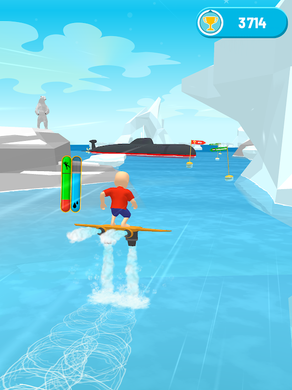 Tap and hold the screen to feed the water into your jet board and make your Flysurf Sky! dash faster and farther! Don’t forget to release your hold when the vibration is too high – otherwise it’s game over!