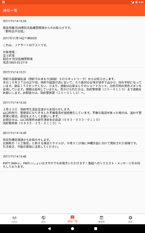 災害・防犯・火災・気象情報などの緊急情報を受信可能です。