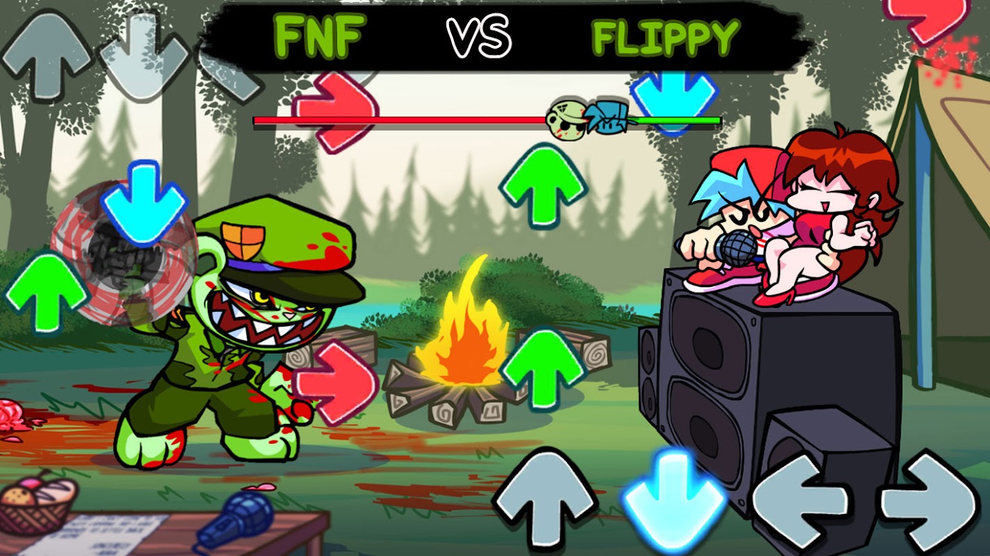 Flippy the unstable apple green bear wants revenge on Boyfriend. While Boyfriend and Girlfriend camped quietly around a wood fire in the forest, Flippy found our two sidekicks and tried to go after them. Fliqpy's aggressiveness was scary but Boyfriend was not going to let it go and it was during a music battle on 4 songs that he will have to try to repel his opponent of the day.