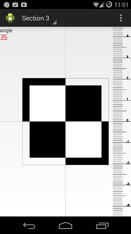 Bảng xếp hạng này được dựa trên Spyder LENSCAL nổi tiếng. Nó được làm bằng một mục tiêu tương phản và một thước đo sự thay đổi tự động lấy nét. Để sử dụng nó đúng cách, bạn cần phải nghiêng thiết bị Android của bạn đến 45 ° từ kế hoạch ngang. Để làm như vậy, một mức độ tinh thần được bao gồm trong ứng dụng đó cho bạn thấy khi góc là chính xác.