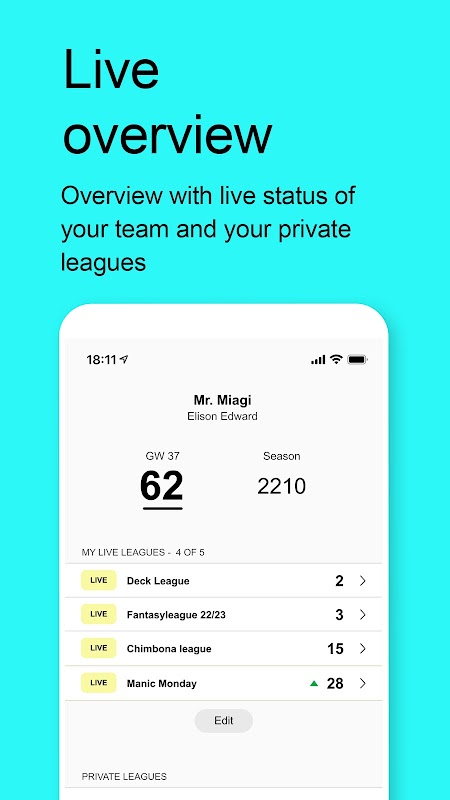 Xem điểm, phần thưởng và thứ hạng mini-league của bạn được cập nhật trực tiếp trong khi các trận đấu đang diễn ra. Theo dõi các đối thủ và theo dõi sự thay đổi theo thời gian thực.