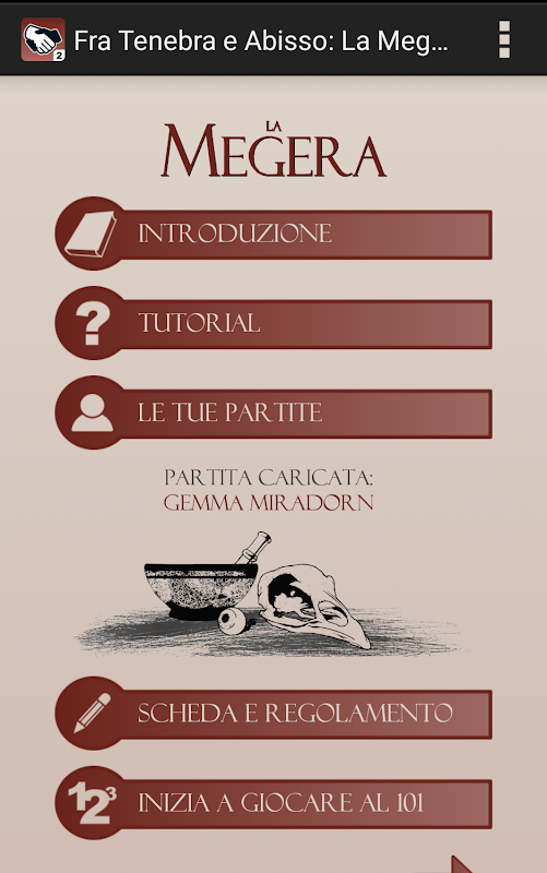 The Megera là tập thứ hai của saga nổi tiếng «Fra Tenebra e Abisso», bắt đầu với «il Marchio». Nếu bạn yêu thích thư viện sách và phiêu lưu văn bản và bạn thích các trò chơi nhập vai và văn học tương tác, bạn sẽ thấy trong tác phẩm này, lơ lửng giữa văn học và trò chơi, không khí của các trò chơi sách giả tưởng cũ kết hợp với tính thực tế và khả năng chơi của một ứng dụng.