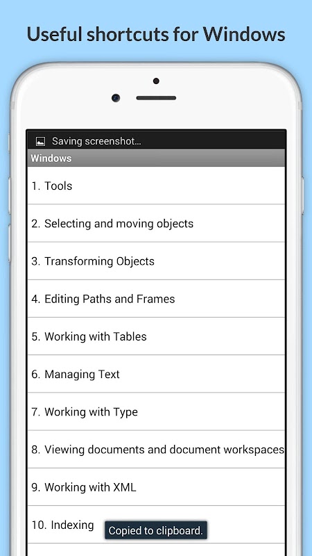 This application is designed to support you with a list of useful InDesign keyboard shortcuts. You can quickly learn the InDesign hotkey that will optimize your work and save your time. It provides keyboard shortcuts for both Windows and Mac OS.